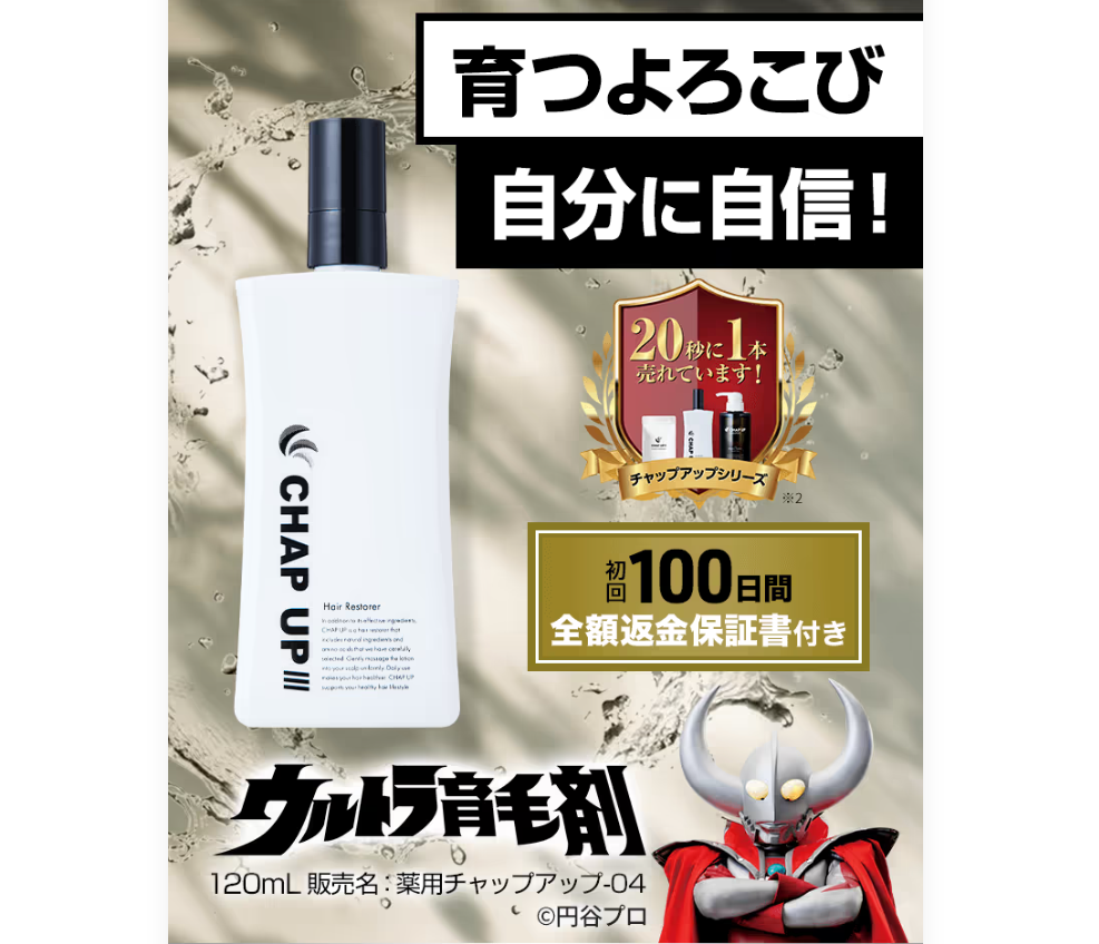 チャップアップは業界最大の実績を誇る育毛剤。薄毛や抜け毛で悩む方に安全かつ効果的なケアを提供します。無添加・無香料で安心して毎日使用でき、永久返金保証もあるため初めての方でもリスクなく試せます。継続使用で髪のハリやボリューム改善が期待でき、多くのユーザーが満足する育毛剤です。