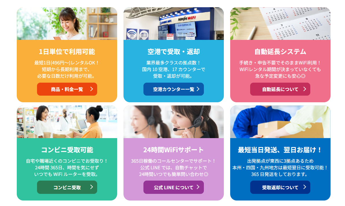 海外在住者の一時帰国や、国内出張者に特に便利。全国10空港18カウンターで受取・返却ができるため、日本に到着した瞬間からネット環境を確保でき、手間なく返却可能です。