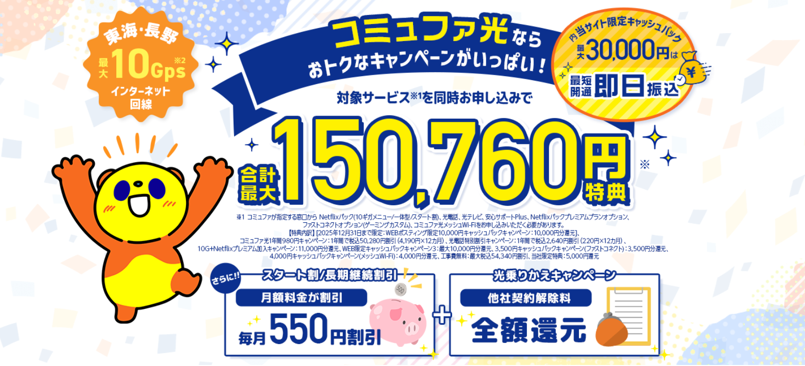 公式サイトの割引に加え、特定の代理店経由でのお申し込みにより、高額なキャッシュバック(現金還元)を受け取れる場合があります。これらの特典を組み合わせることで、導入時の実質費用を大きく抑えることが可能です。(※詳細は各窓口のキャンペーンをご確認ください)