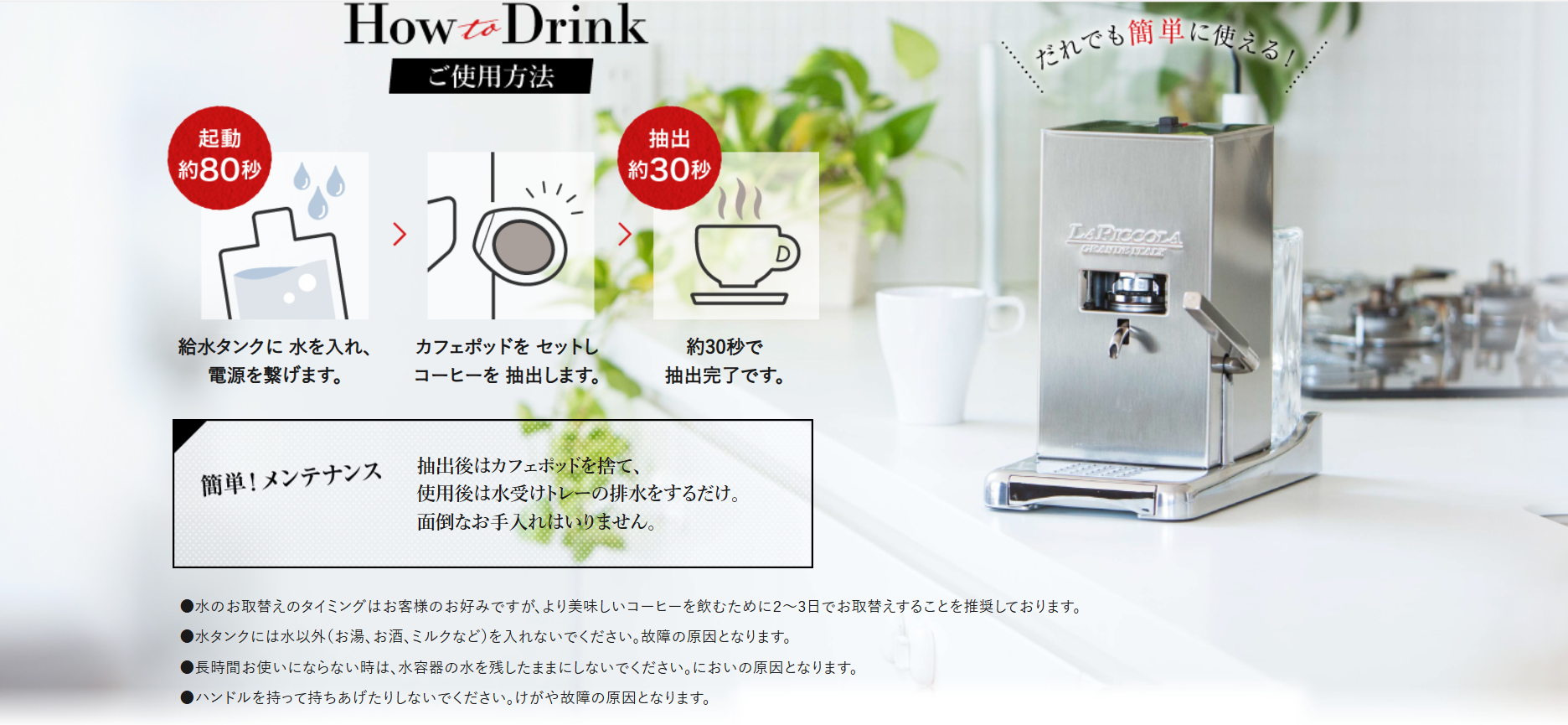 A: ルカフェのコーヒーマシンはシンプル設計でお手入れも簡単です。使用後のポッドはそのまま捨てるだけで済み、定期的な部品の洗浄も比較的容易に行えるよう設計されています。
