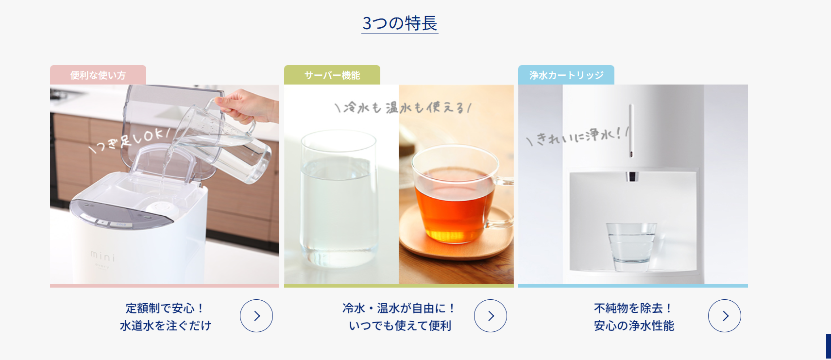 | 水パック | 軽量パックで交換ラクラク | 10Lボトルのみで重い | 12Lボトルのみで交換手間あり |